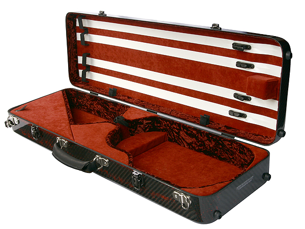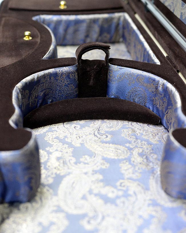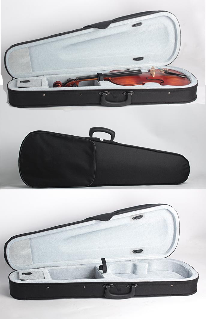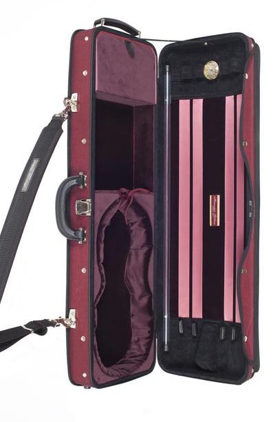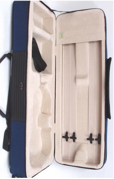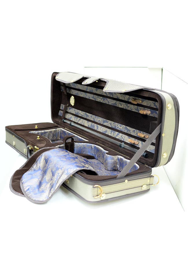 內(nèi)部:室內(nèi)裝飾用仿麂皮材料;定制以適合您的樂器;貝殼側(cè)面填充不同密度泡沫,使儀器的最大安全性;四個(gè)撐弓架;大型配件有藍(lán)色、紅色、淺灰色和綠色;筆記;重量值因研發(fā)過程而變化。