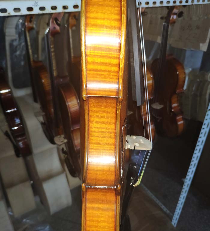 描述:正如大家所看到的的一樣,這把琴有著非常美觀的外形,這取決于它的選材和油漆,背板的花紋看上去非常的自然和諧,面板木紋之間的距離都在2毫米左右;采用亮光的酒精漆,防舊復古的風格更是賦予了這把琴以神秘感。這把琴雖然看上去很硬,但聲音確是非常的柔美,堪稱是一把非常不錯的演奏級小提琴。