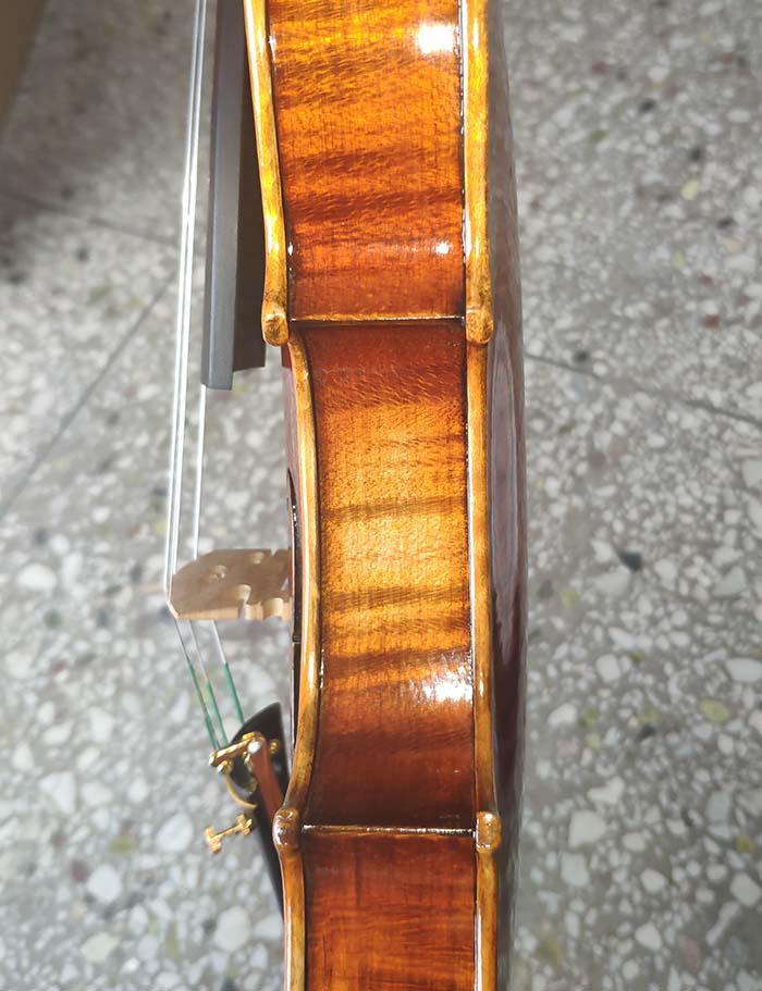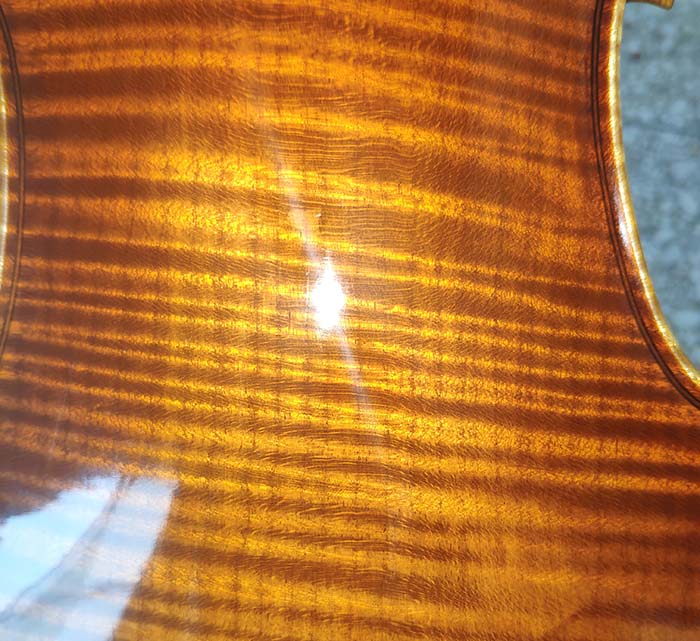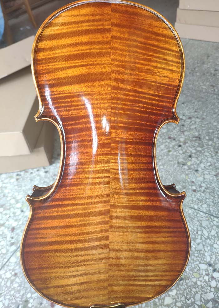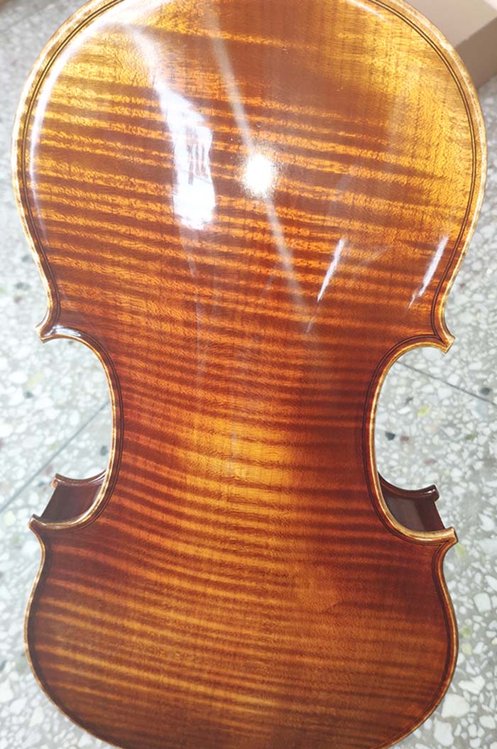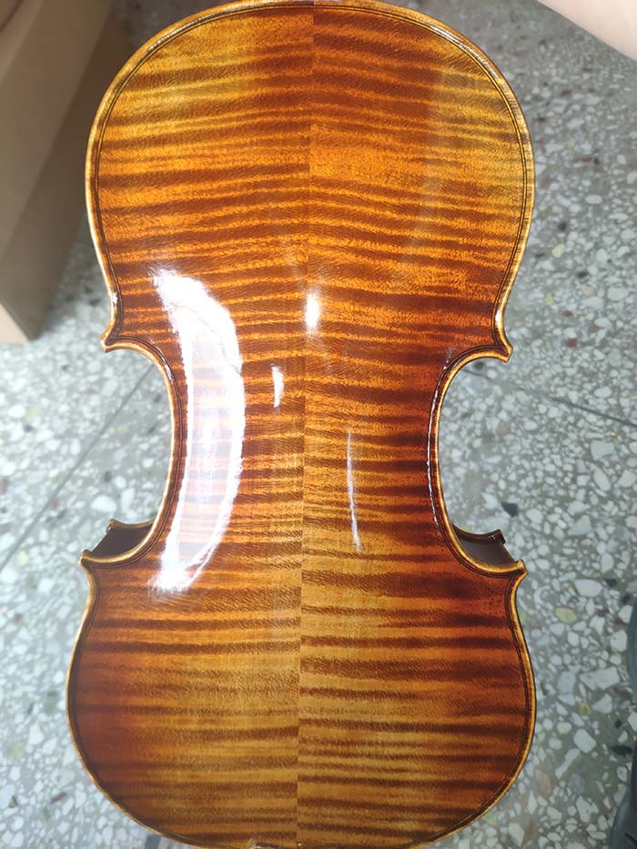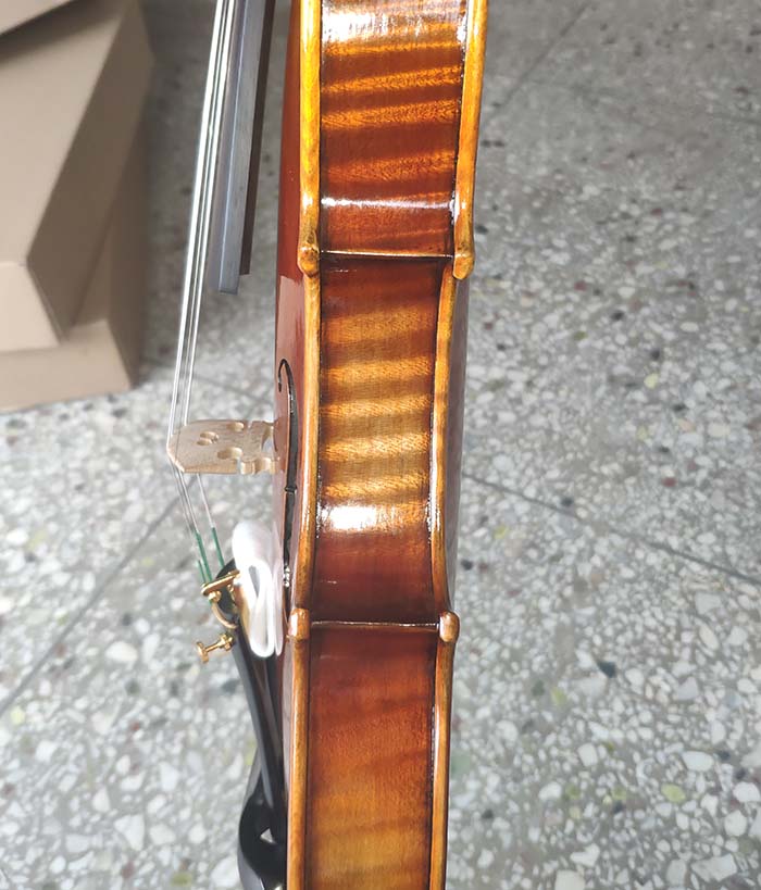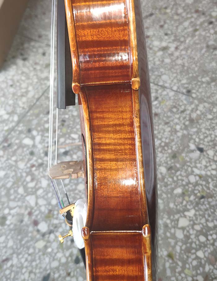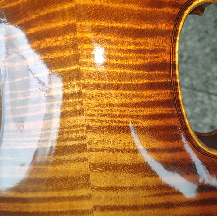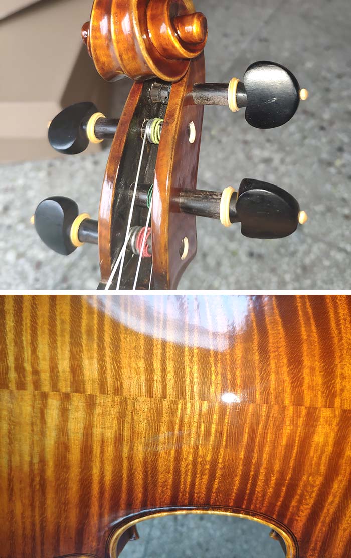 描述:背板是精選花紋均勻的美洲楓木,獨板的背板,面板年輪非常的均勻,木紋的寬度在1.2-1.5毫米。整體的油漆顏色為暗紅色,有仿舊的感覺,聲音清澈明亮,共振比較好。