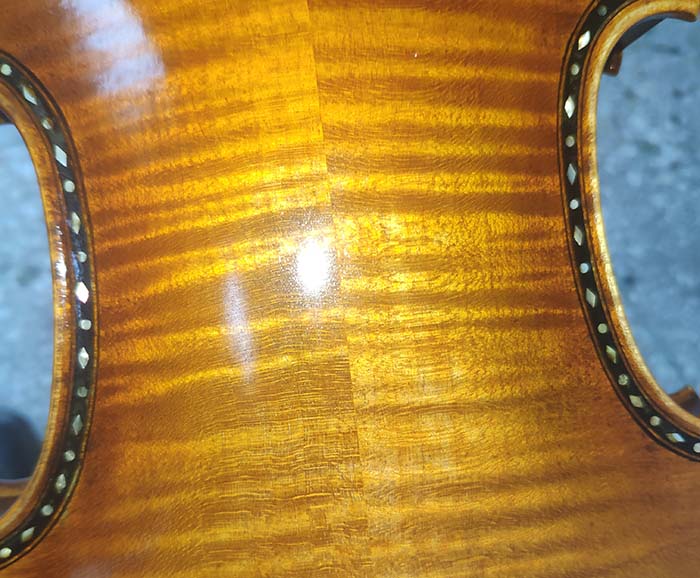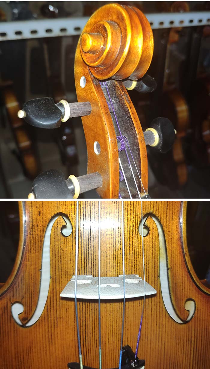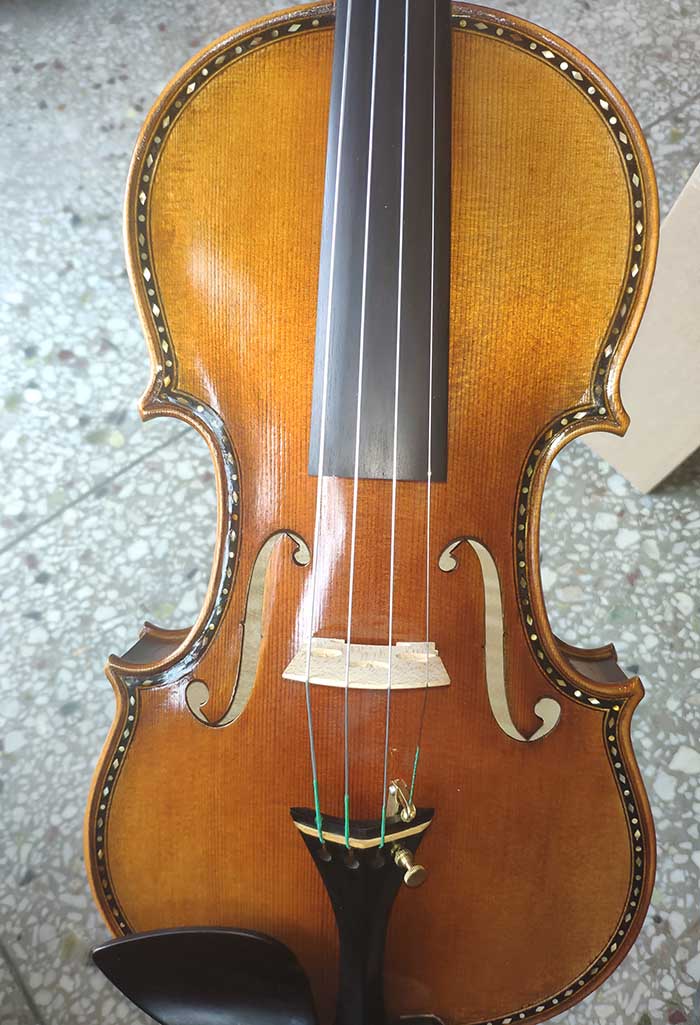 描述:一款非常精致的歐料小提琴,側板和琴頭有雕花,琴的邊緣有貝殼的鑲嵌。面板的木紋寬度在2-3毫米,背板為均勻的歐洲楓木。琴的邊緣部分油漆顏色較淺,中間部分的油漆偏深。這把琴音質非常棒,非常甜美輕盈的感覺,專業演奏者的標配。