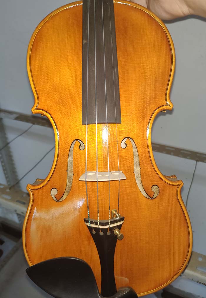 評價:這是一把非常美麗的雀眼楓背板的手工小提琴,整體顏色看上去較紅,背板上零星散落的雀眼雖然不過,但是和木材上面的深色云紋搭配起來會顯得非常美觀。面板的木質(zhì)非常均勻,木紋的平均距離都在1.5毫米左右。就琴的聲音來說,我個人感覺是聲音比較平穩(wěn),共振比較好。