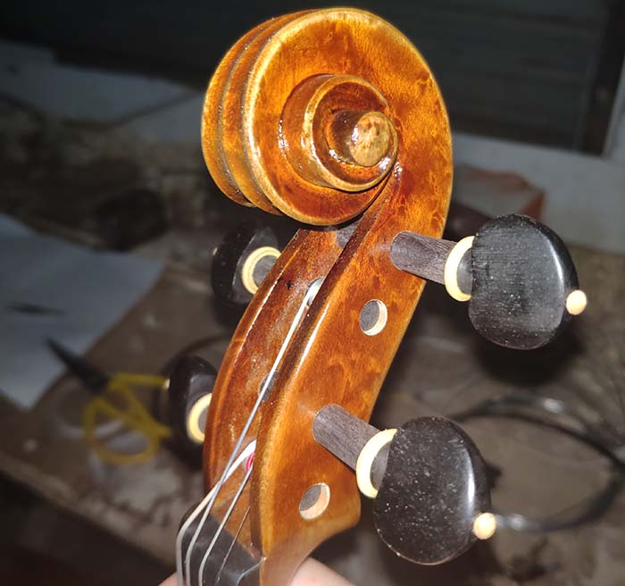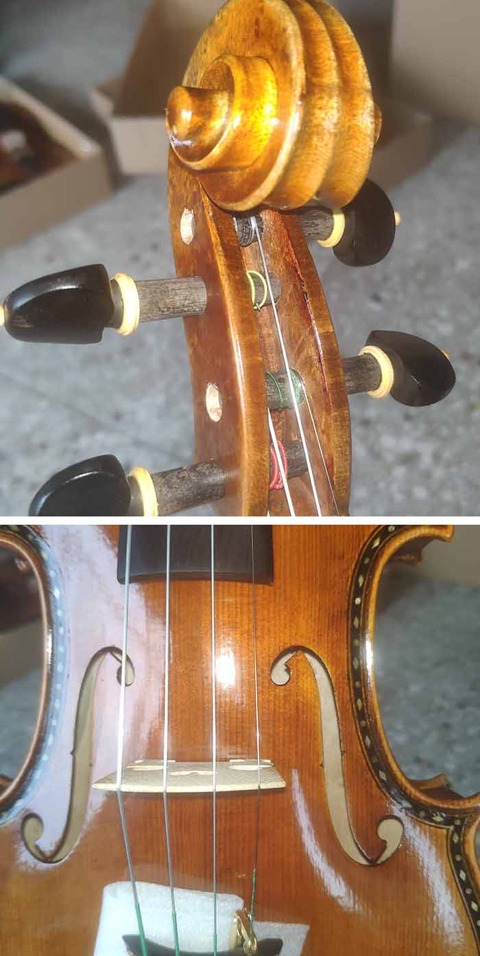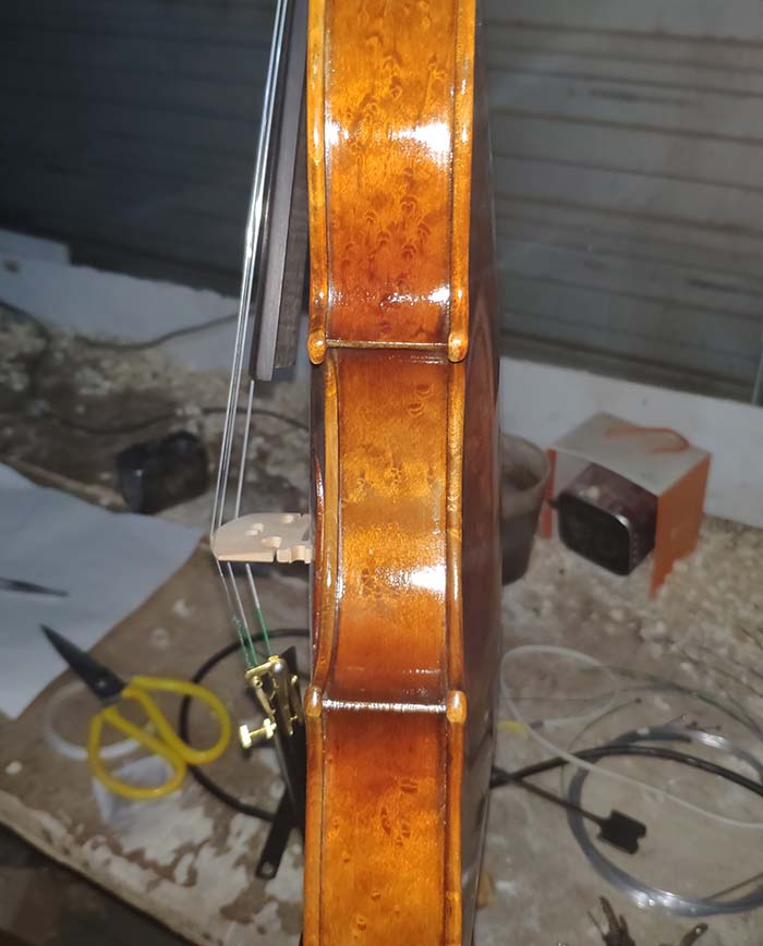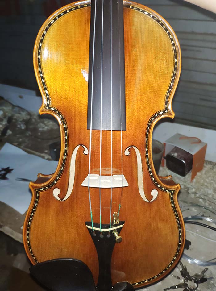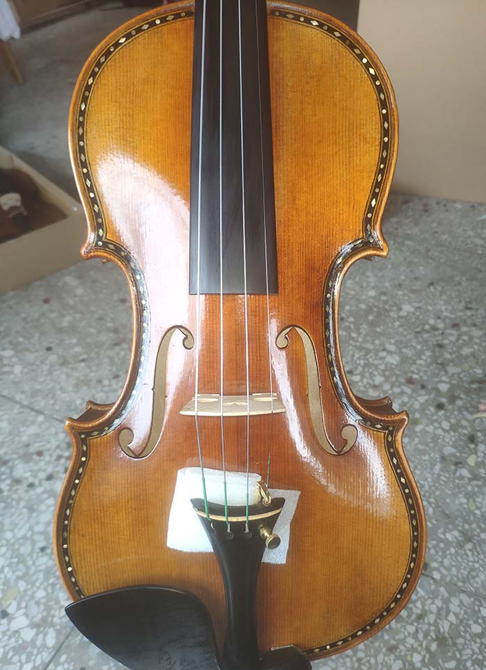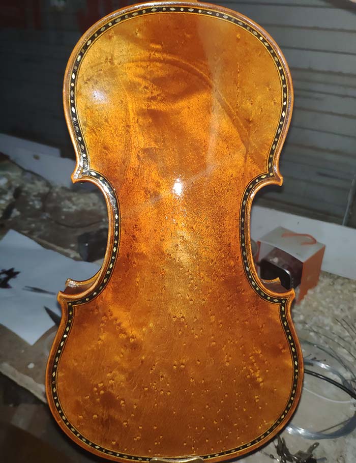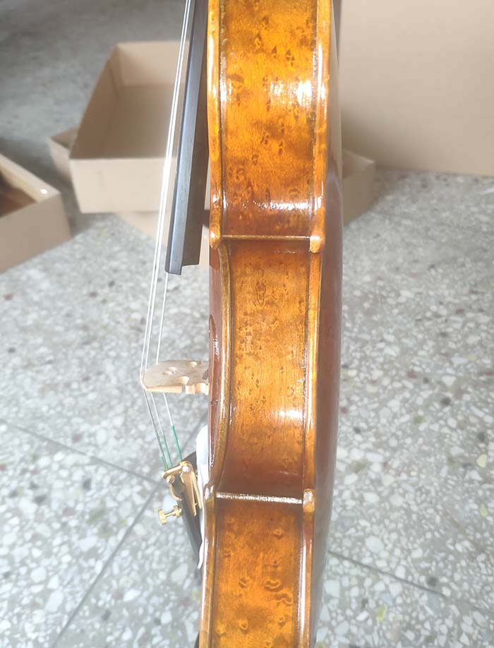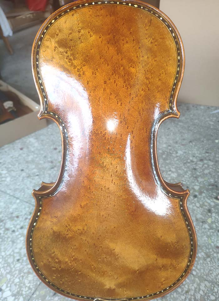 描述:背板是意大利的雀眼花紋的楓木,雀眼并不算很多,面板木質(zhì)均勻,木紋的平均寬度在2.5毫米左右。油漆采用仿舊風(fēng)格,顏色有深有淺,質(zhì)感非常好。這把琴的聲音比較清晰干脆,婉轉(zhuǎn)悠揚,非常適合專業(yè)演奏和練習(xí)使用,更是當(dāng)做禮物來贈送的不二之選。