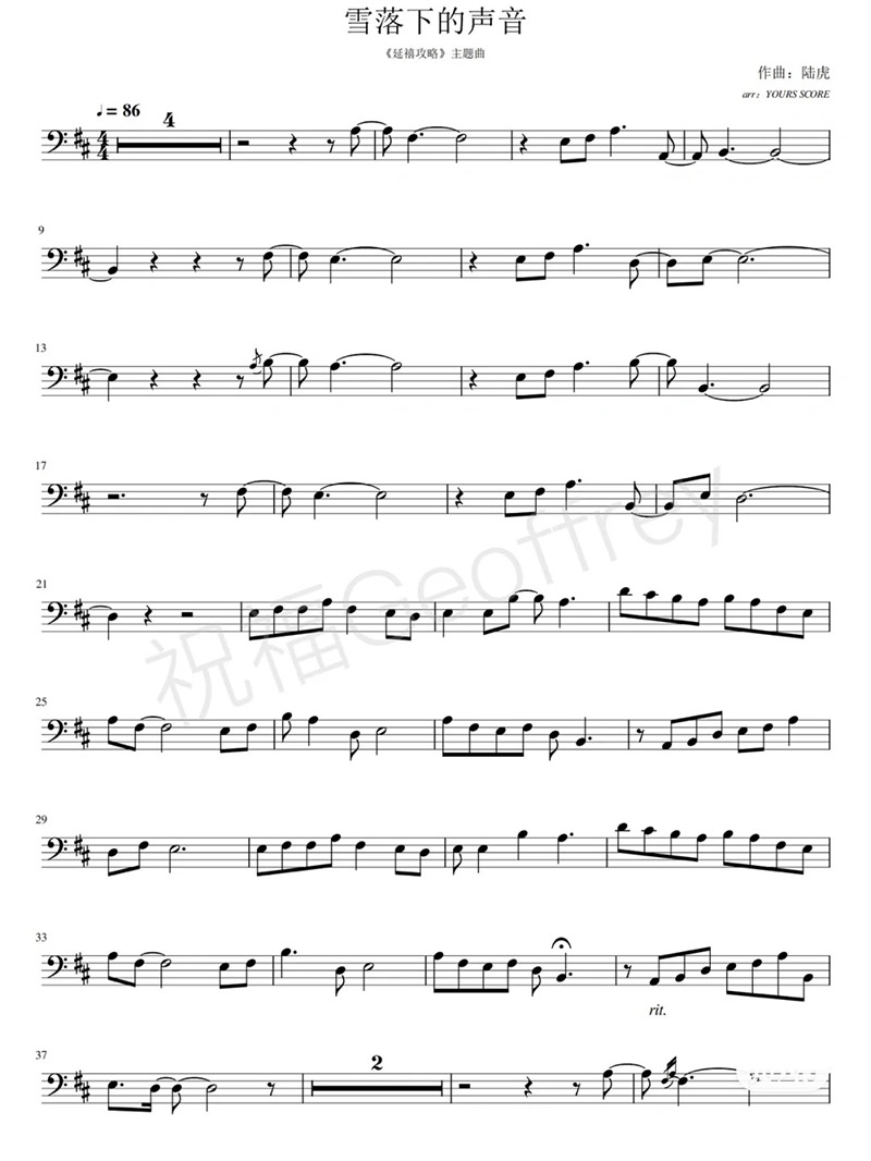 這首大提琴版本的《雪落下的聲音》舒緩的旋律,仿佛置身于唯美靜謐的白雪世界:任憑慢慢落下的雪花染白頭發(fā),打濕睫毛,融化掌心,然后回眸微笑,身邊的他在輕聲喚你卿卿,幻想時光停在這一刻,便是永恒。歌詞細膩婉轉(zhuǎn),描述的正是故事里的情節(jié)人物。今天將《雪落下的聲音》大提琴譜分享給大家,希望大家能夠好好練習(xí)。